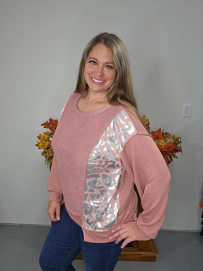 DUSTY LAVENDER RASIED RIBBED KNIT TOP W/ ANIMAL RUFFLE CONTRAST SLEEVES