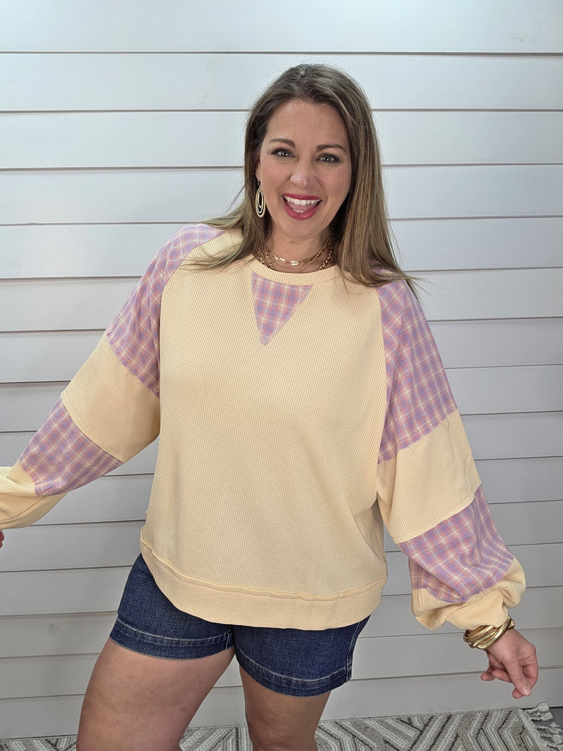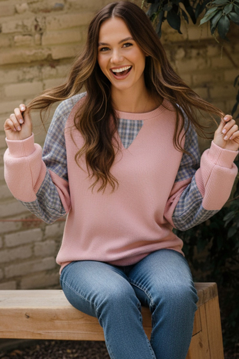 BLUSH/BLUE PLAID KNIT WAFFLE TEXTURE LONG SLEEVE KNIT TOP