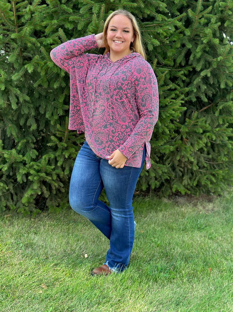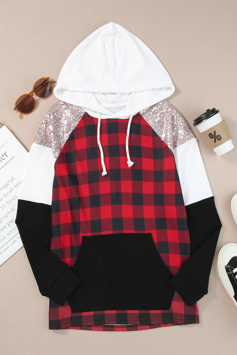RED/BLACK/GREEN PLAID COLORBLOCK HOODED TOP