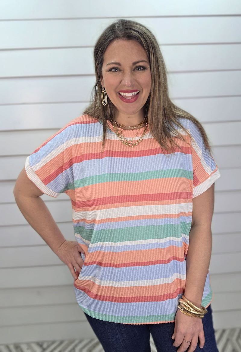 CORAL MULTI STRIPED RAISED RIBBED KNIT TOP