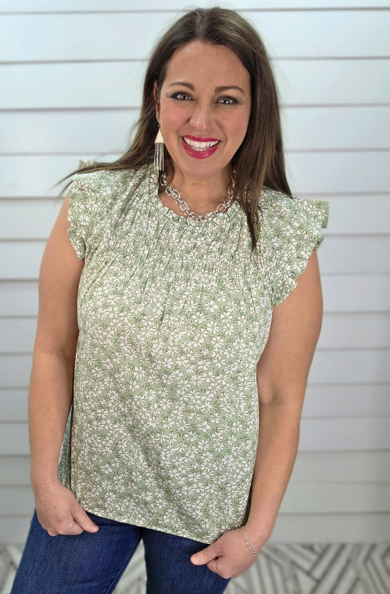 MINT FLORAL RUFFLE BUTTER SOFT KNIT TOP