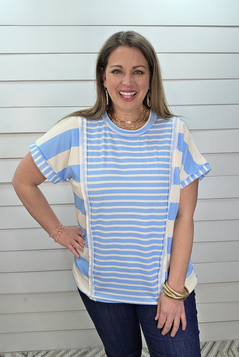 CREAM/BLUE CONTRAST STRIPED RAISED RIBBED KNIT TOP