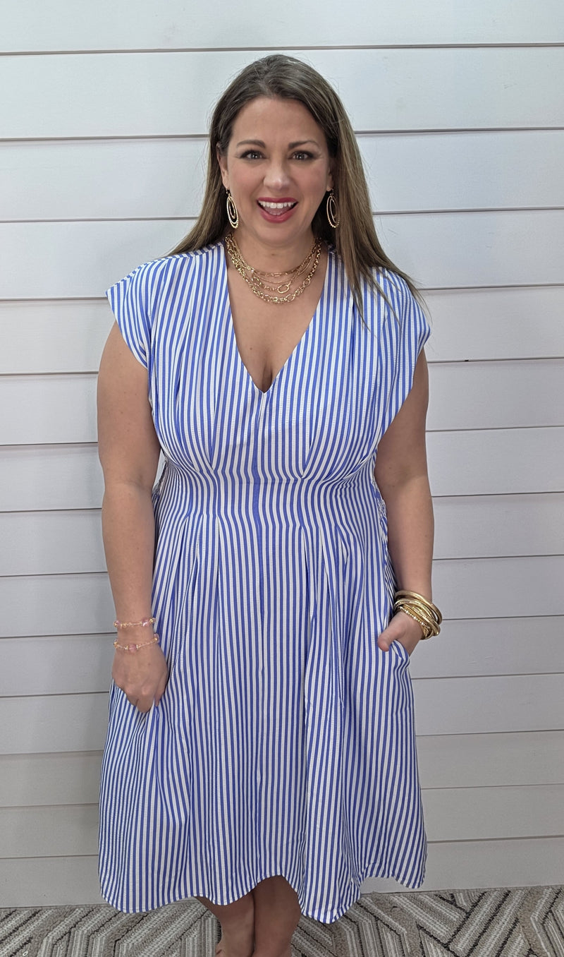 BLUE STRIPED V NECK PLEATED WOVEN DRESS W/ BACK SMOCKING