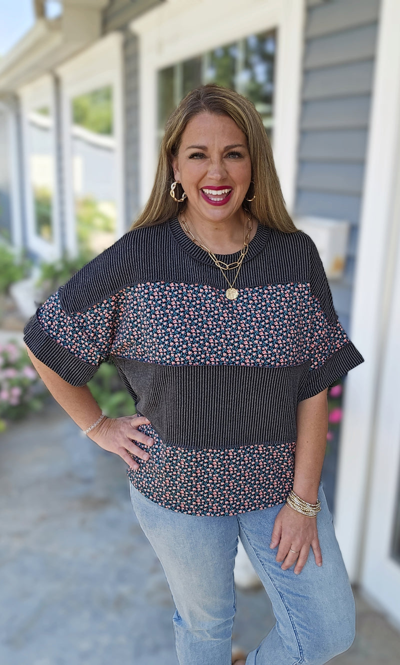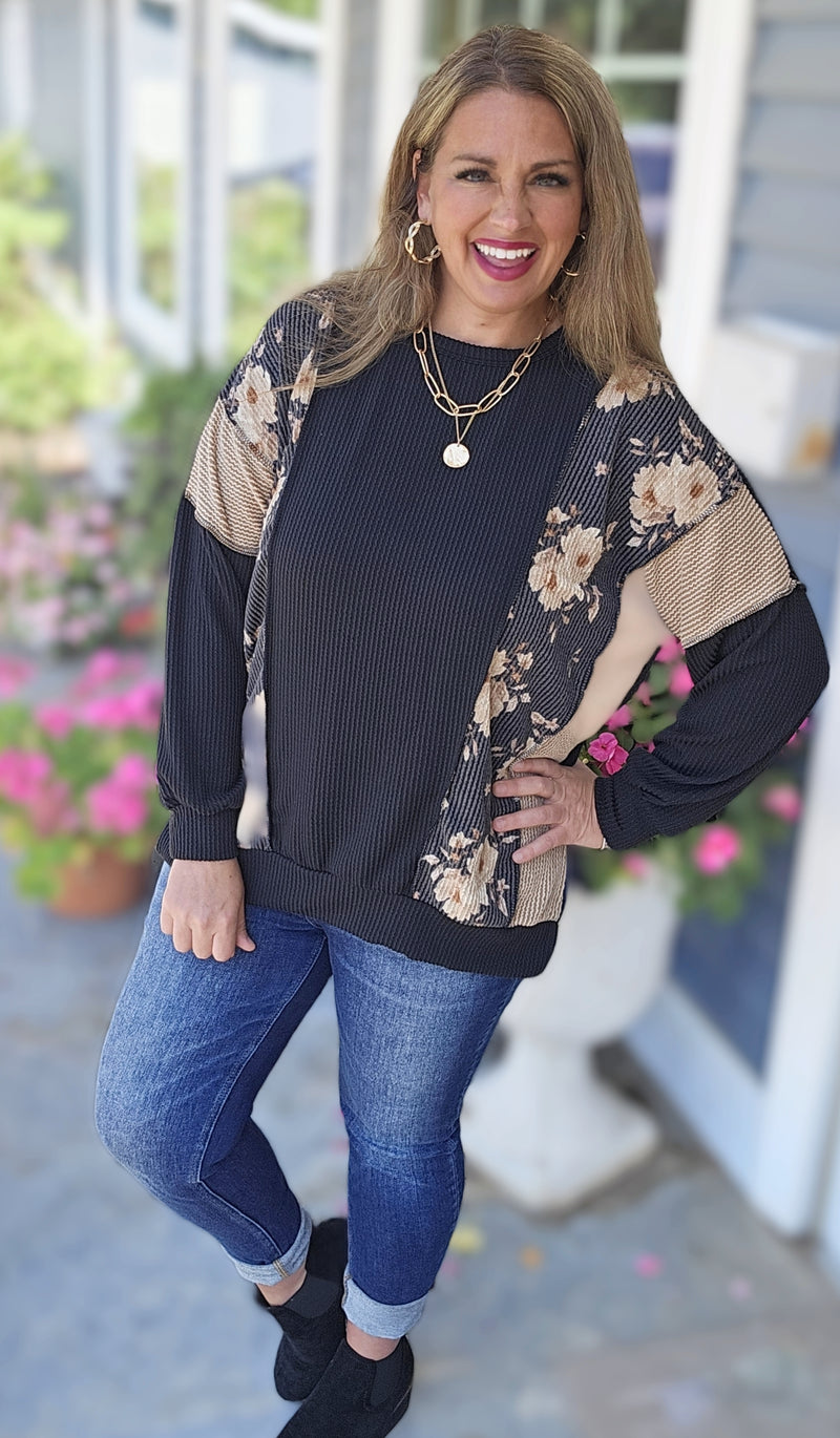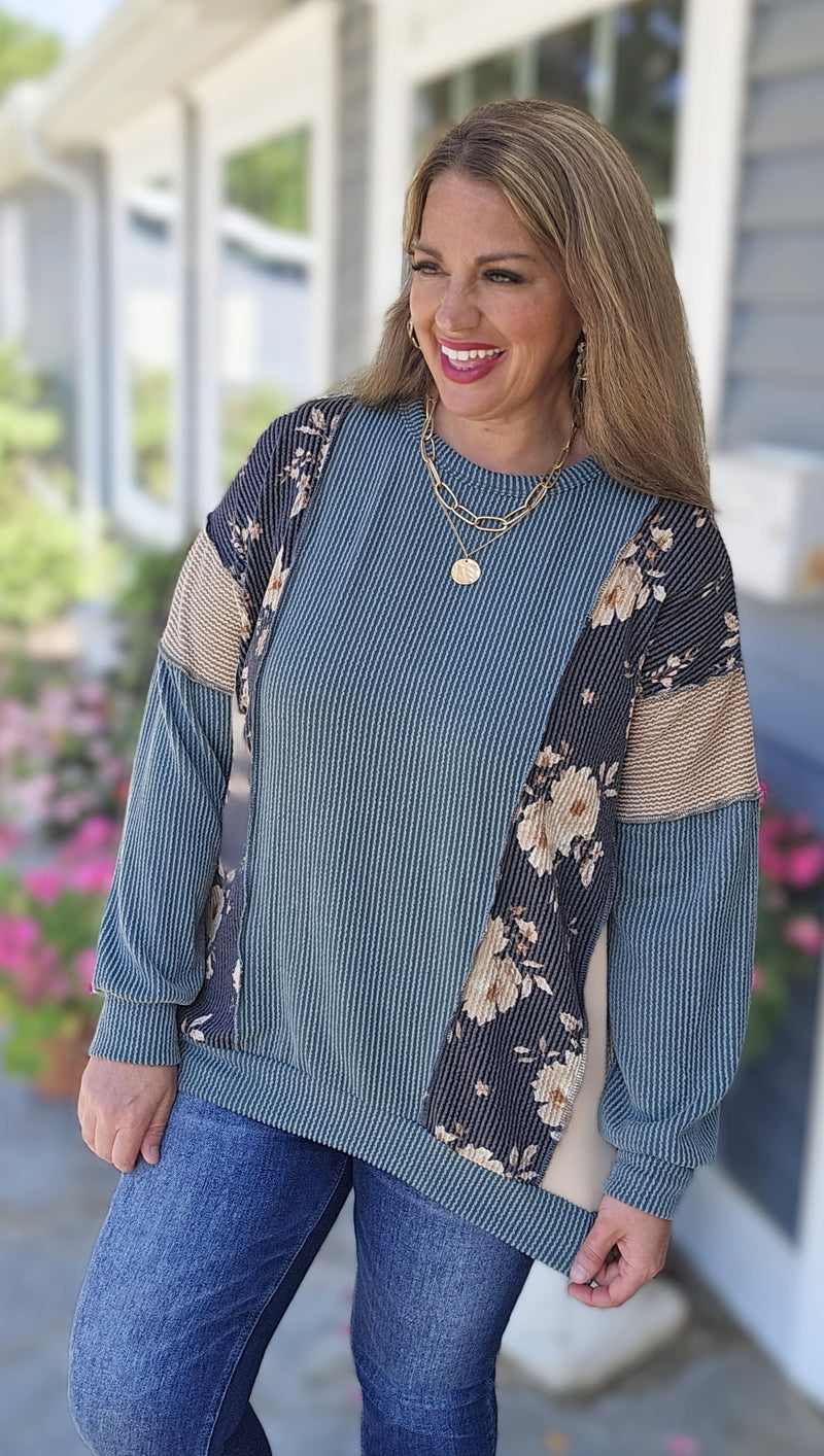 MINT/GREY FLORAL CONTAST OVERSIZED KNIT TOP