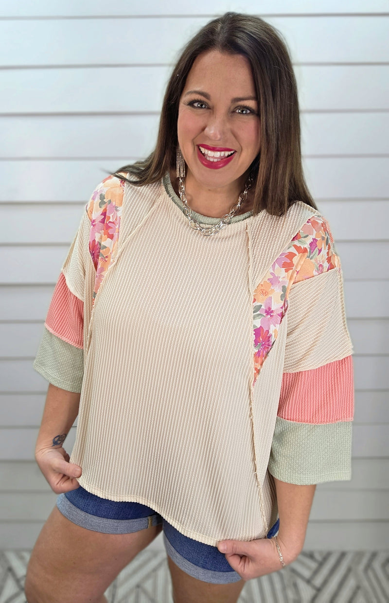 OATMEAL/CORAL/SAGE RAISED RIBBED COLORBLOCK SLEEVE LOOSE FIT TOP