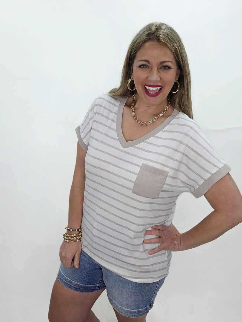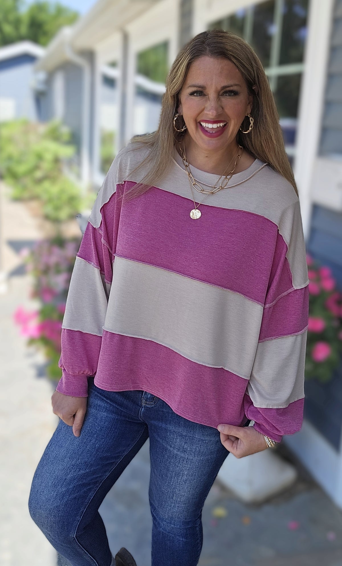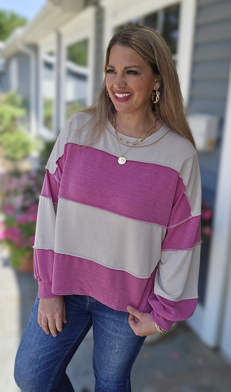 TAUPE/CREAM STRIPED SWEATER W/ HOT PINK TRIM