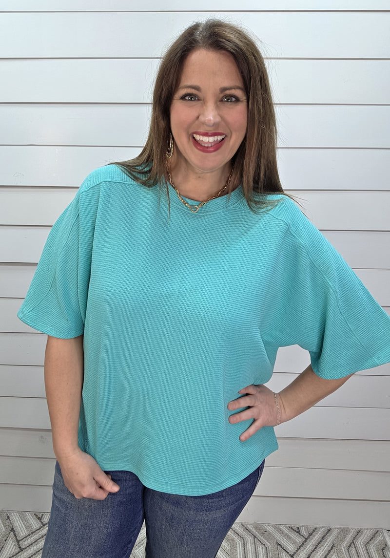 GREEN/CREAM TEXTURED STRIPED DROP SHOULDER WOVEN TOP