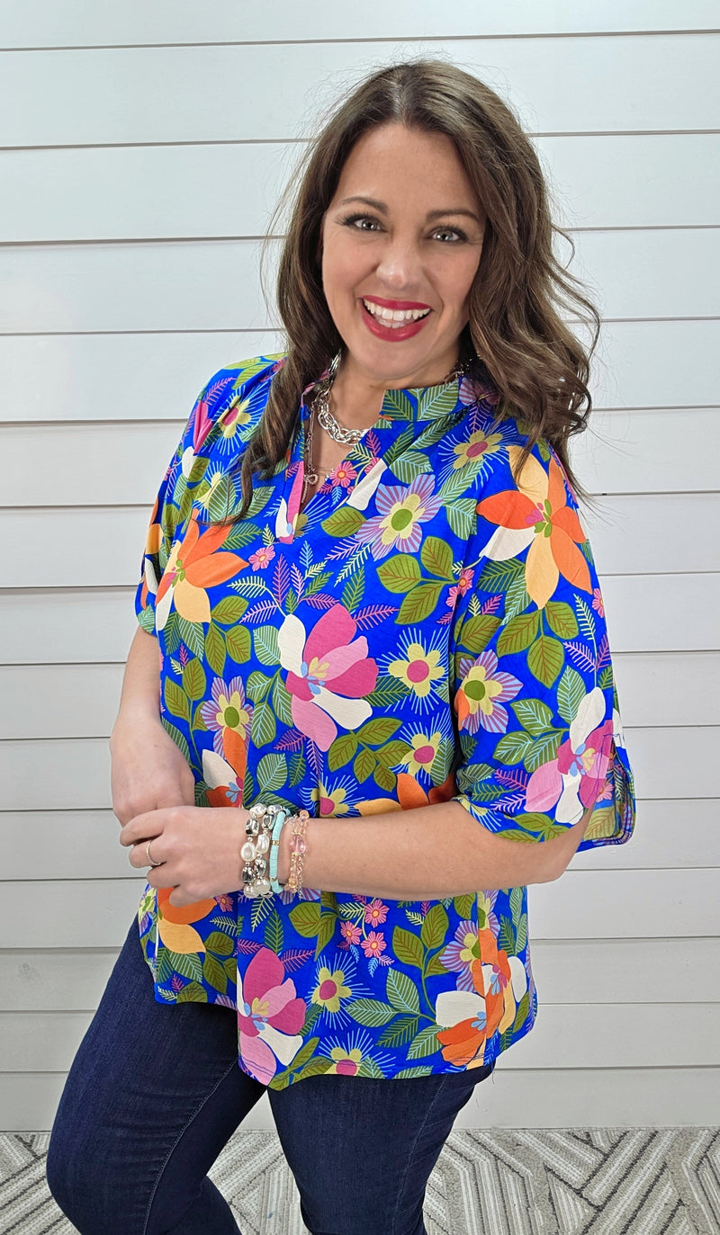 DEAR SCARLETT BREEZE SPLIT SLEEVE TOP - ROYAL BLUE MULTI COLOR PRINTED