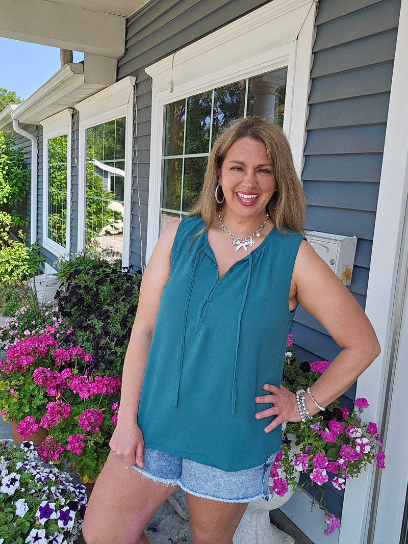 DARK JADE TIE HALF BUTTON SLEEVELESS SOLID AIRFLOW TANK