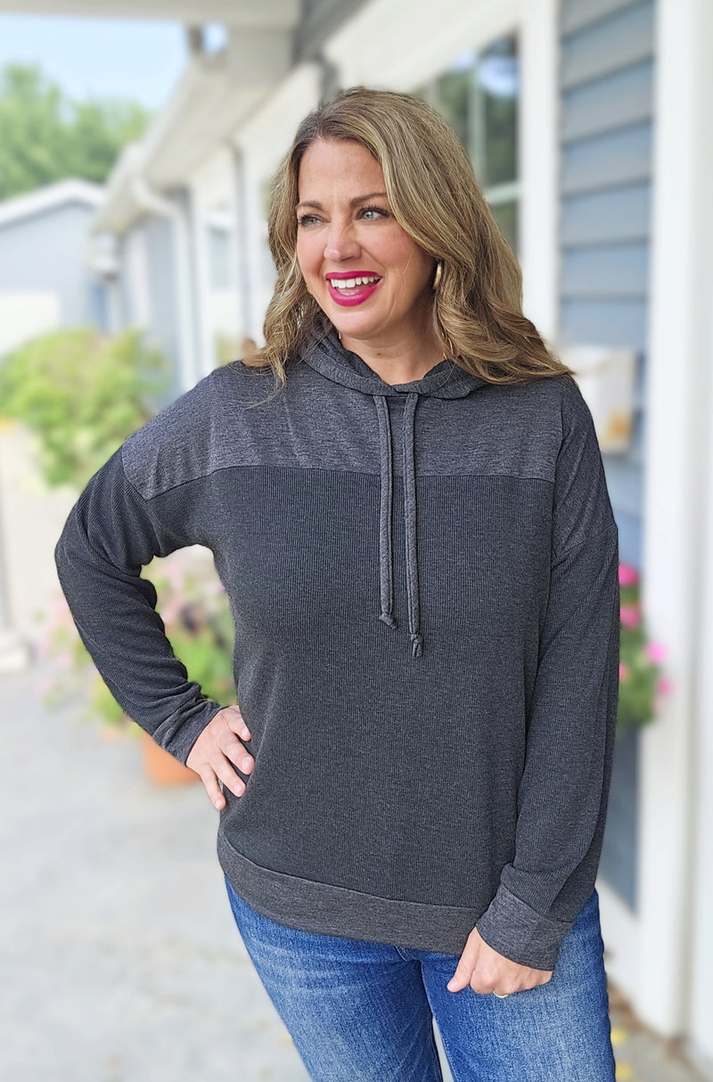 DARK CHARCOAL FABRIC BLOCKED LONG SLEEVE HOODED PULLOVER