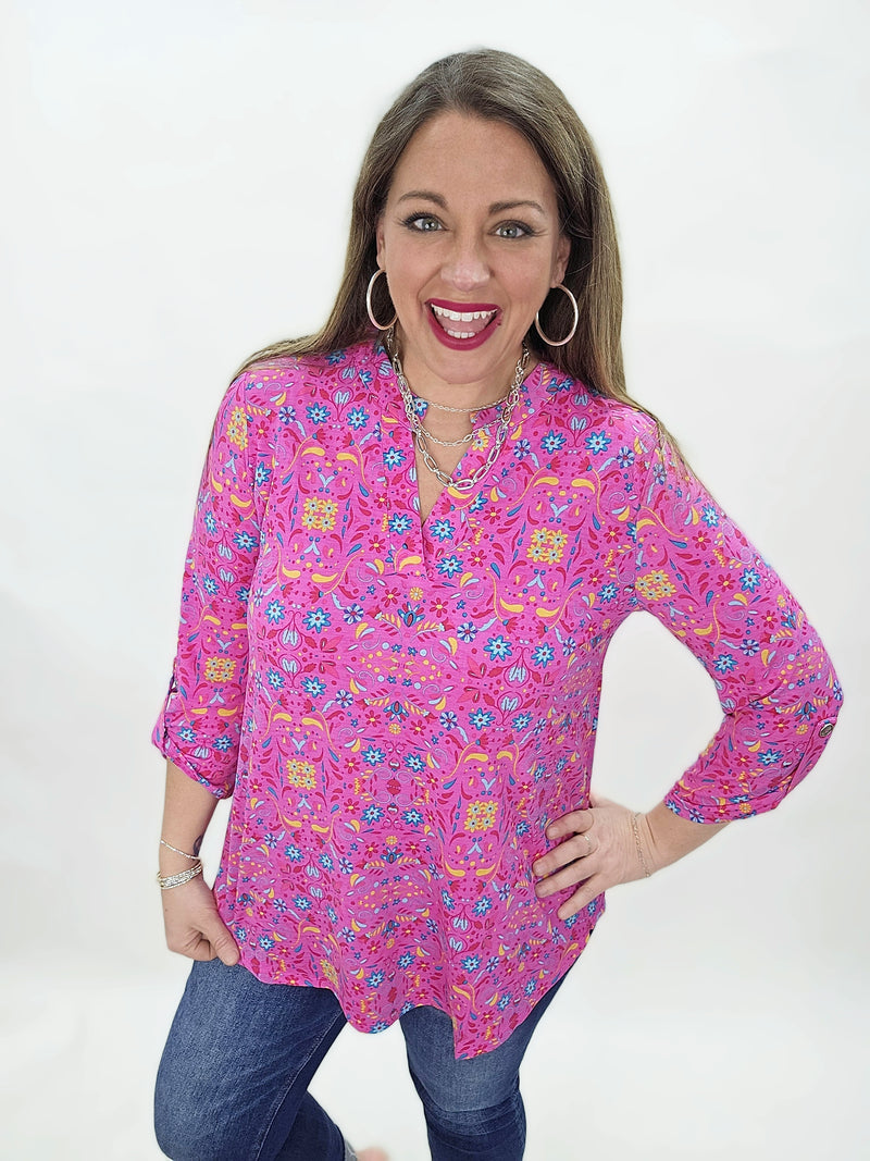 DEAR SCARLETT - LIZZY TOP - PINK/BLUE MULTI PRINT