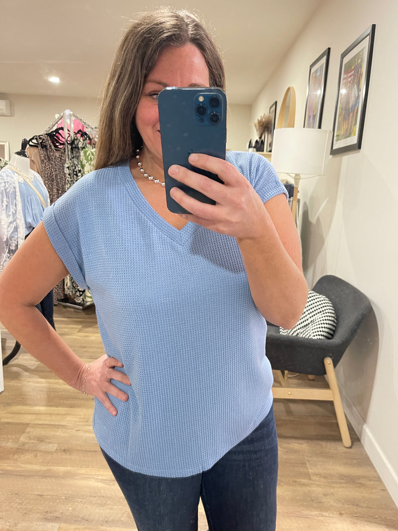 DENIM BLUE V NECK WAFFLE TEXTURE CUFF SLEEVE TOP