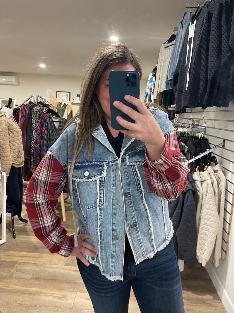 DENIM JACKET W/ PLAID SLEEVES AND REMOVEABLE HOOD