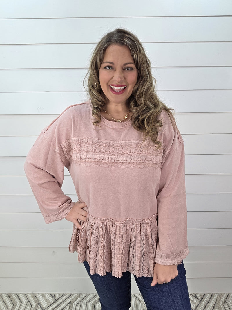 DUSTY ROSE LACE TRIM FRILL FRENCH TERRY TOP