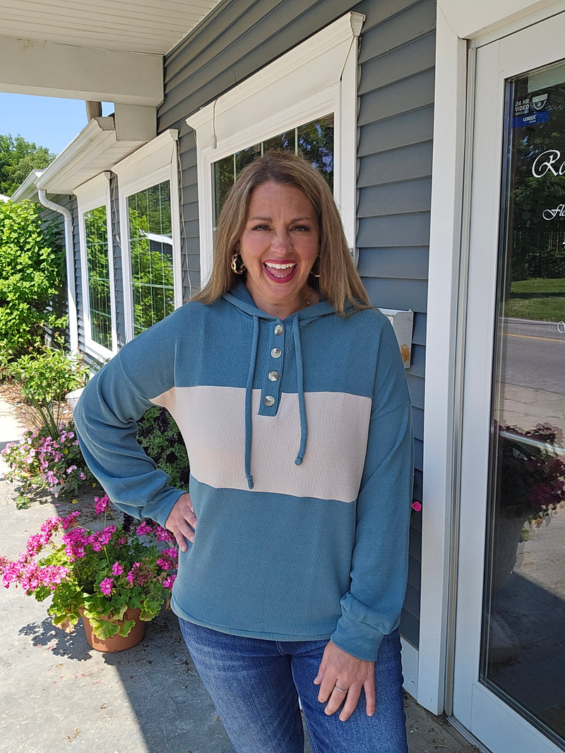 DUSTY TEAL HALF BUTTON COLOR BLOCK LONG SLEEVE KNIT HOODIE