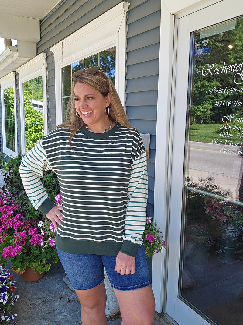 FOREST/CREAM GREEN MIX STRIPED LONG SLEEVE FRENCH TERRY TOP