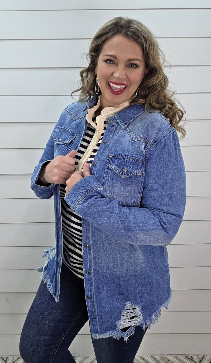 MEDIUM WASH DISTRESSED DENIM SHIRT