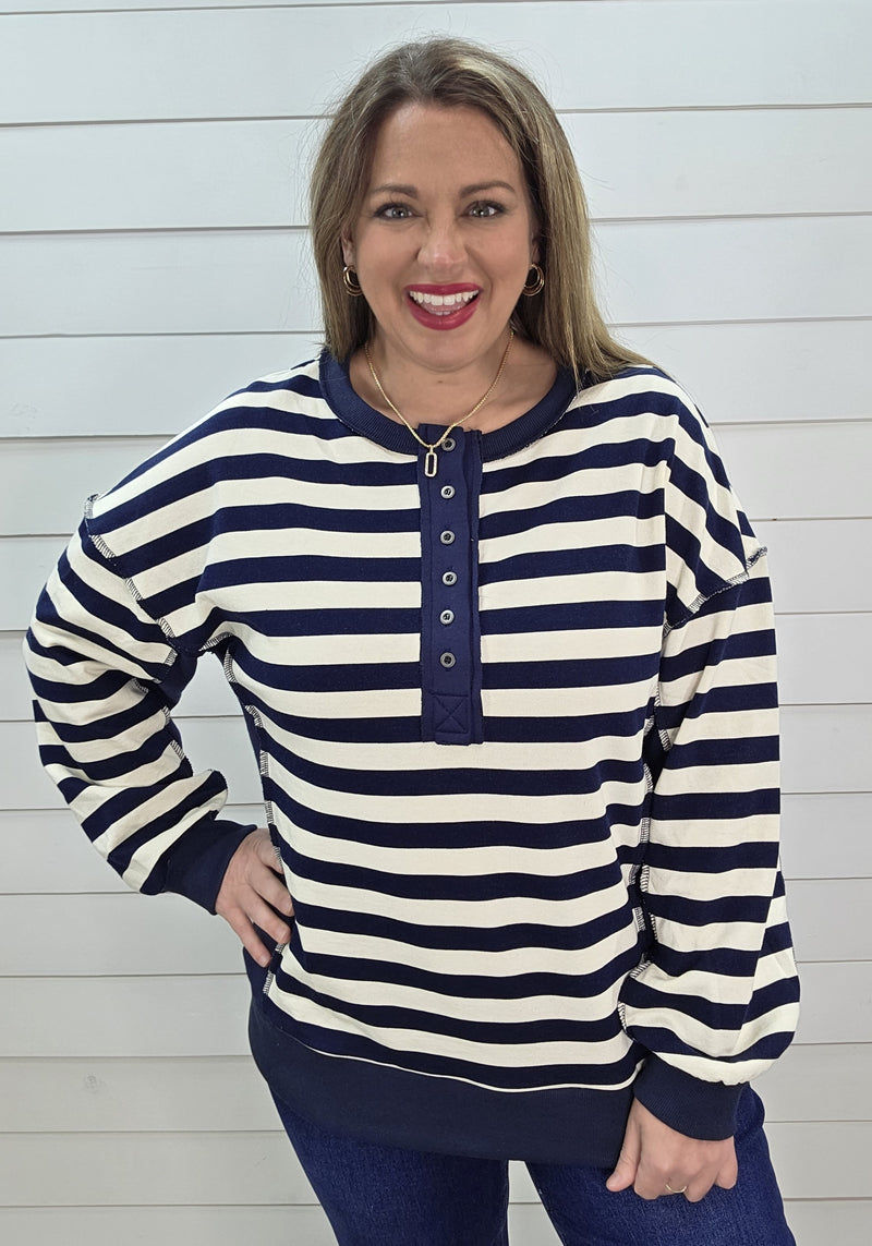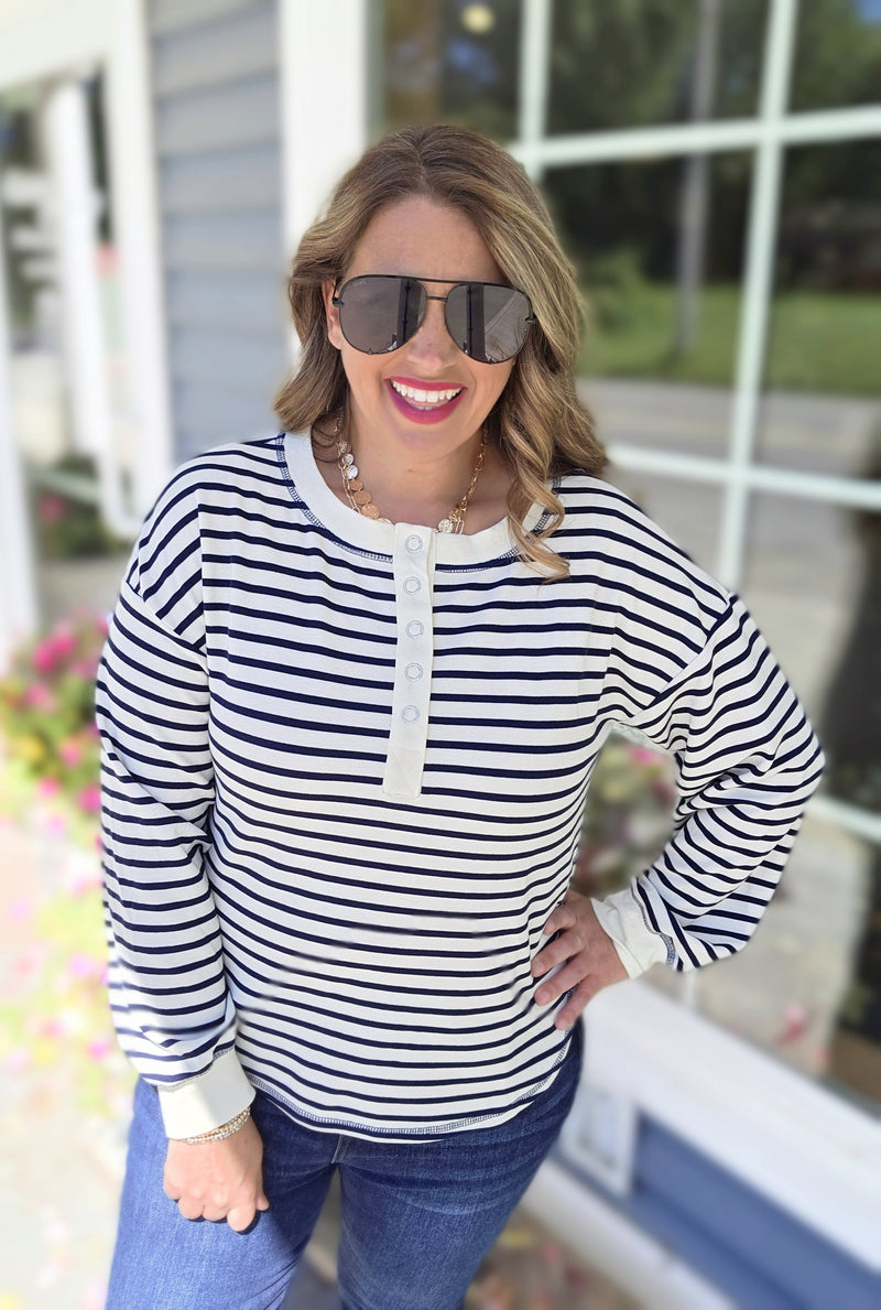 NAVY/CREAM STRIPED SNAP BUTTON HENLEY TOP