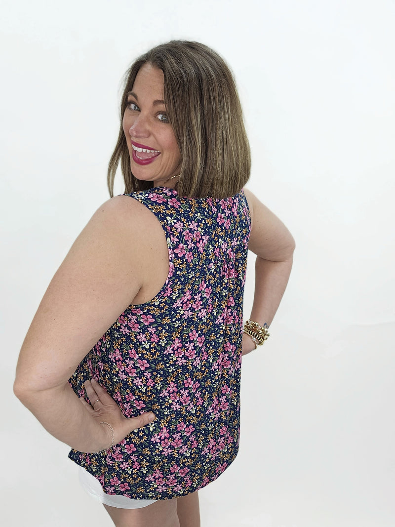 NAVY/PINK PETITE FLORAL WOVEN SLEEVELESS TOP