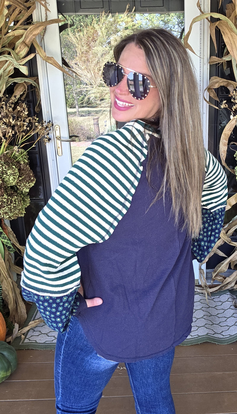 NAVY/HUNTER GREEN STRIPED FLORAL CONTRAST SLEEVE TOP