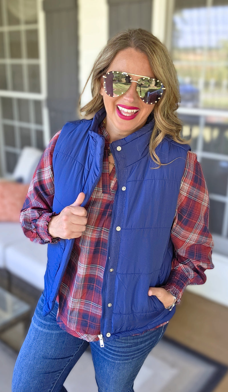 NAVY/ASH OVERSIZED PLAID BUTTON DOWN TOP