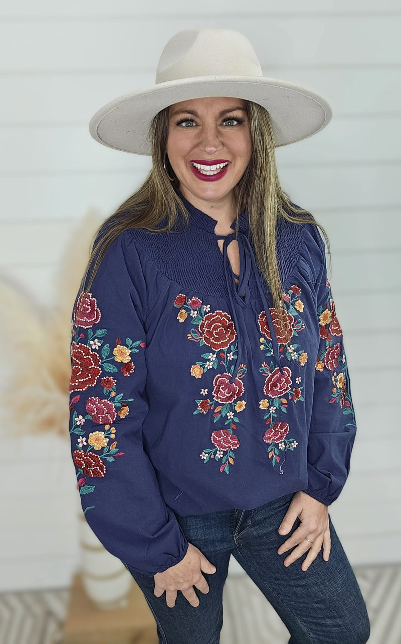 NAVY/GREEN FLORAL GEO PRINT V NECK KNIT TOP