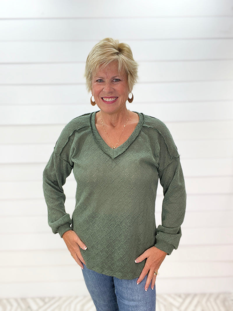 OLIVE POINTELLE V NECK KNIT LONG SLEEVE TOP