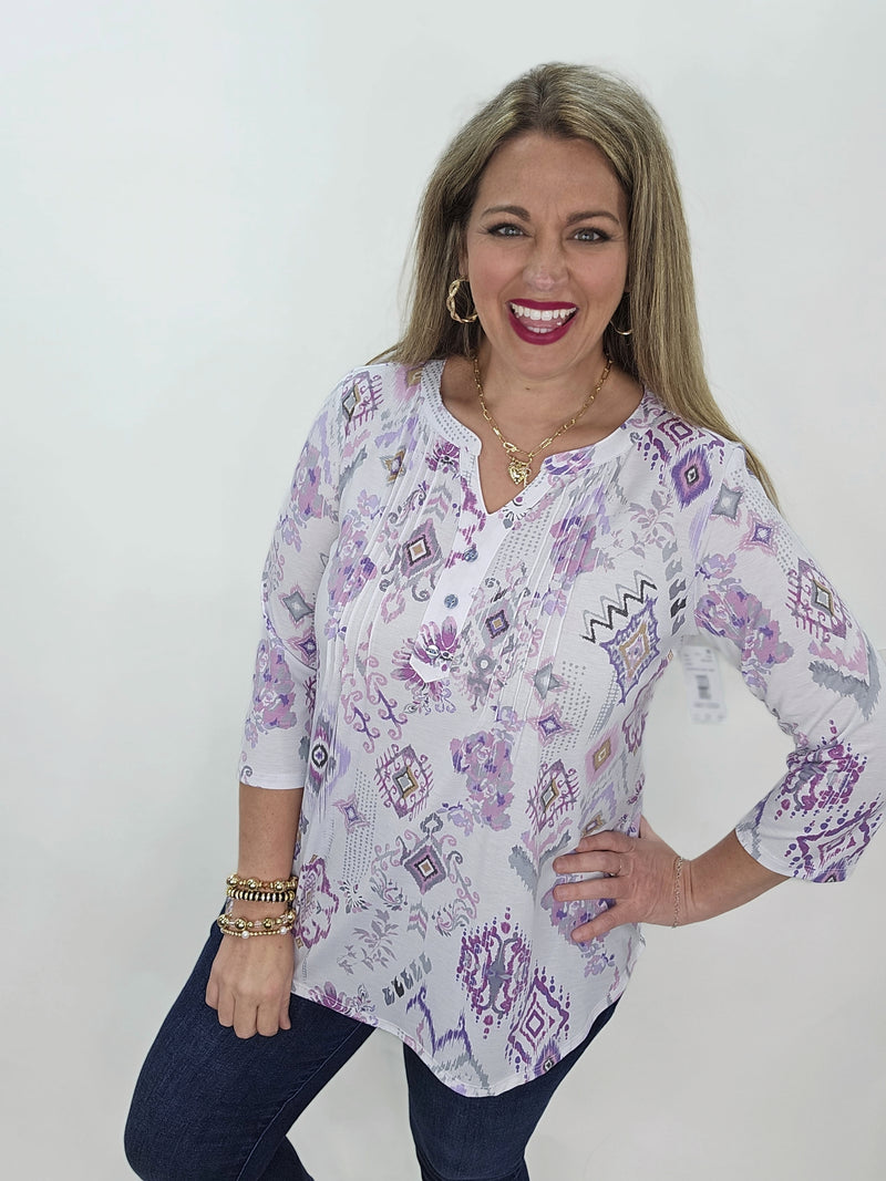 OFF WHITE/PURPLE PRINTED PLEATED KNIT TOP