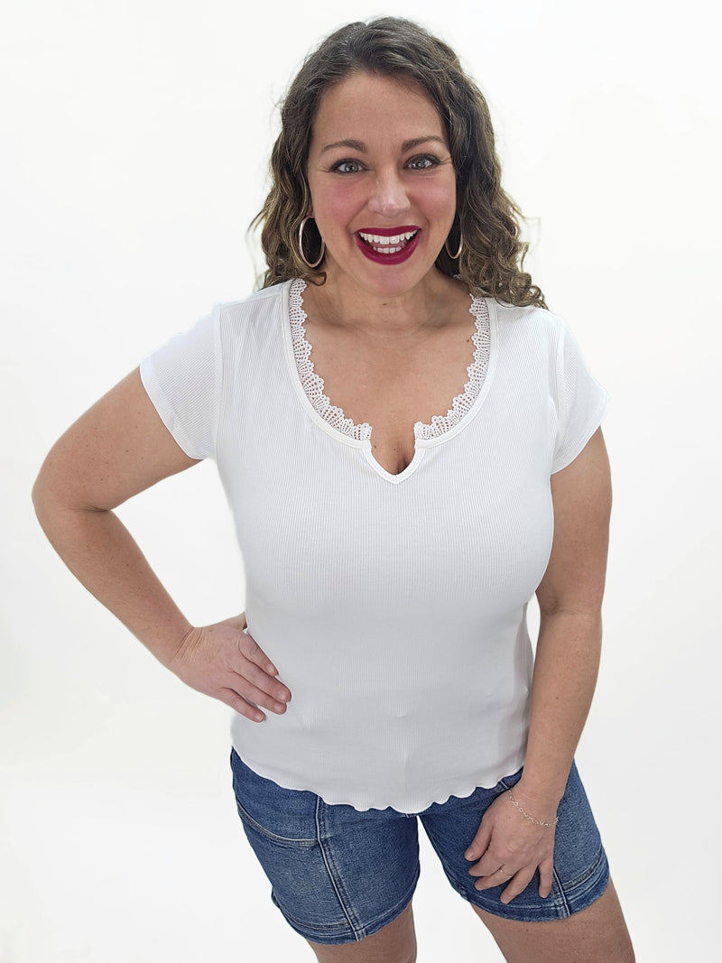 OFF WHITE SOFT RIB SCOOP NECK LACE TRIM TOP