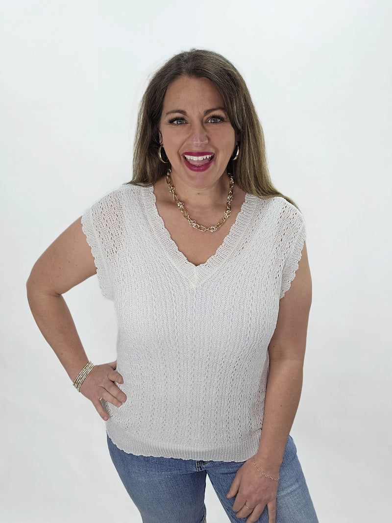 OFF WHITE V NECK LIGHT WEIGHT OPEN KNIT TOP