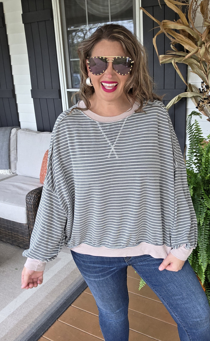 OLIVE STRIPED CONTRAST BLOCK PULLOVER