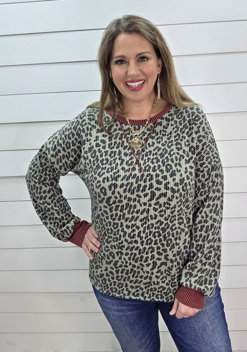 OLIVE ANIMAL PRINT RAISED RIBBED TOP W/ BURGUNDY TRIM