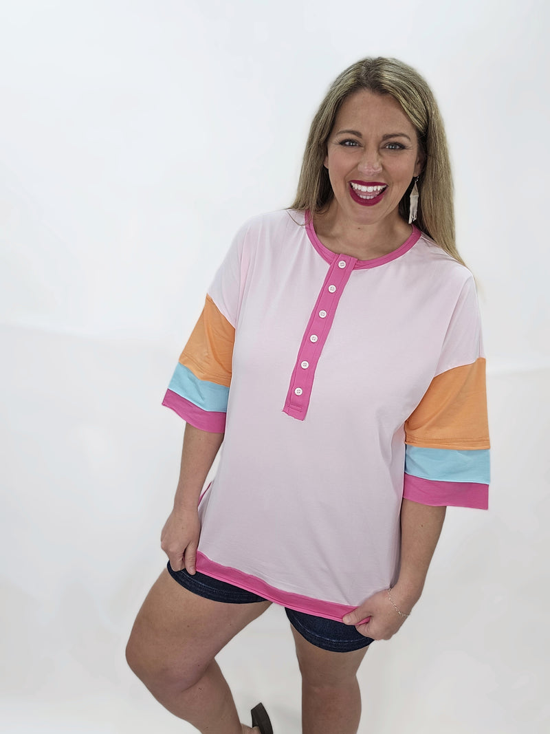PINK BRIGHT COLORBLOCK HENLEY KNIT TOP