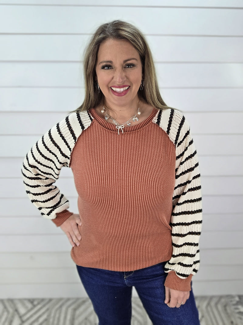 RUST RAISED RIBBED/STRIPED CONTRAST SLEEVE KNIT TOP