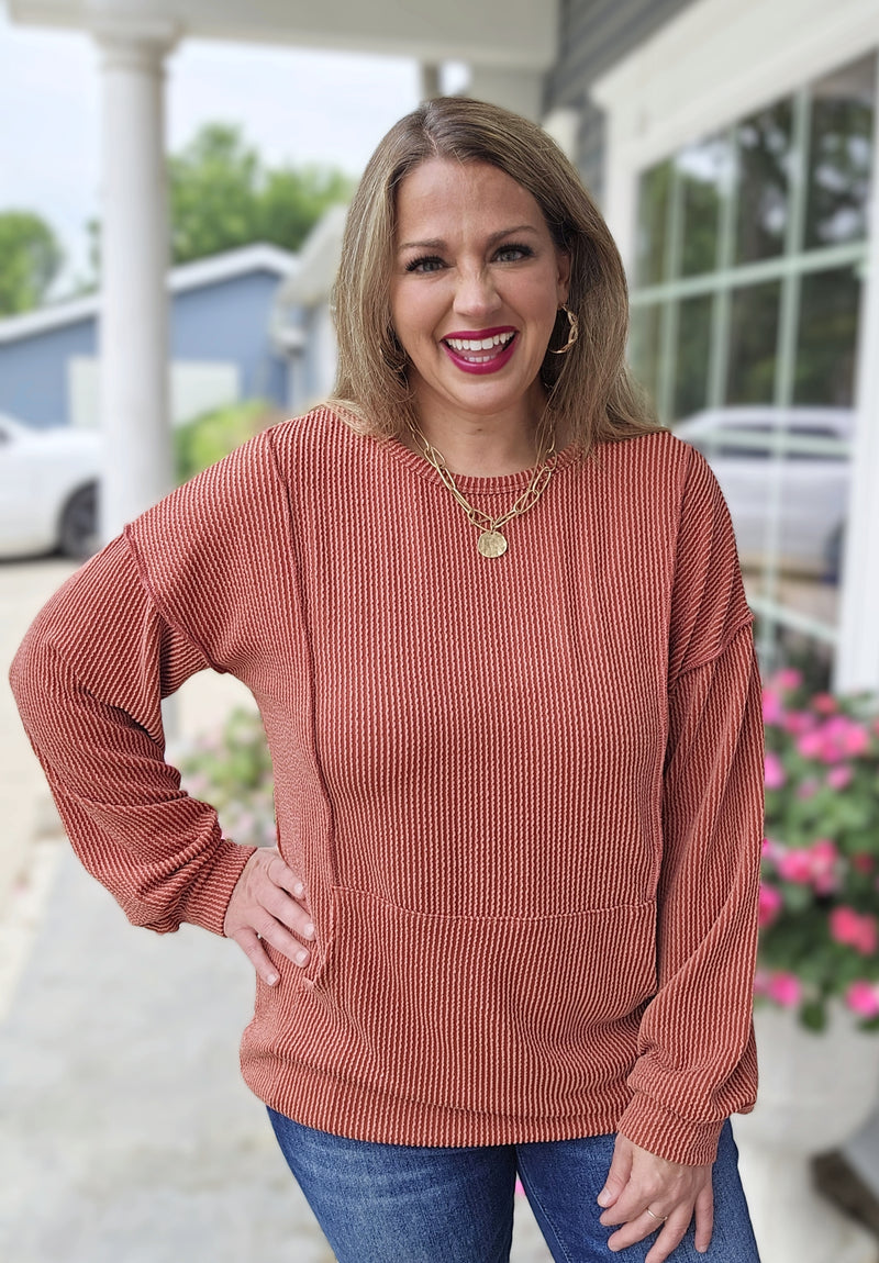 RUST RAISED RIBBED TOP WITH KANGAROO POCKET