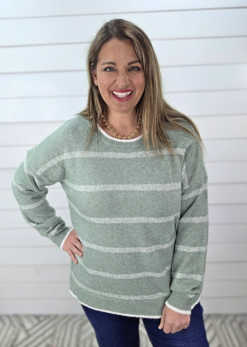 SAGE/CREAM STRIPED KNIT LIGHT WEIGHT SWEATER