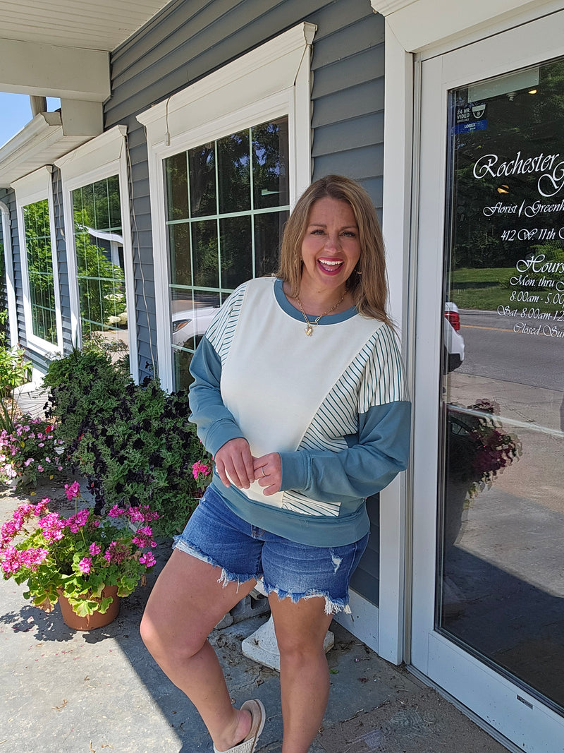 SAGE STRIPED PATCHWORK FRENCH TERRY DOLMAN PULLOVER