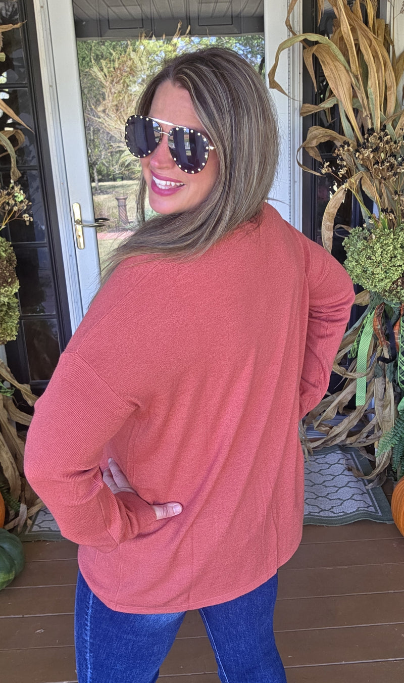 RUST RAISED RIBBED KNIT TOP WITH LEOPARD ACCENT SLEEVE