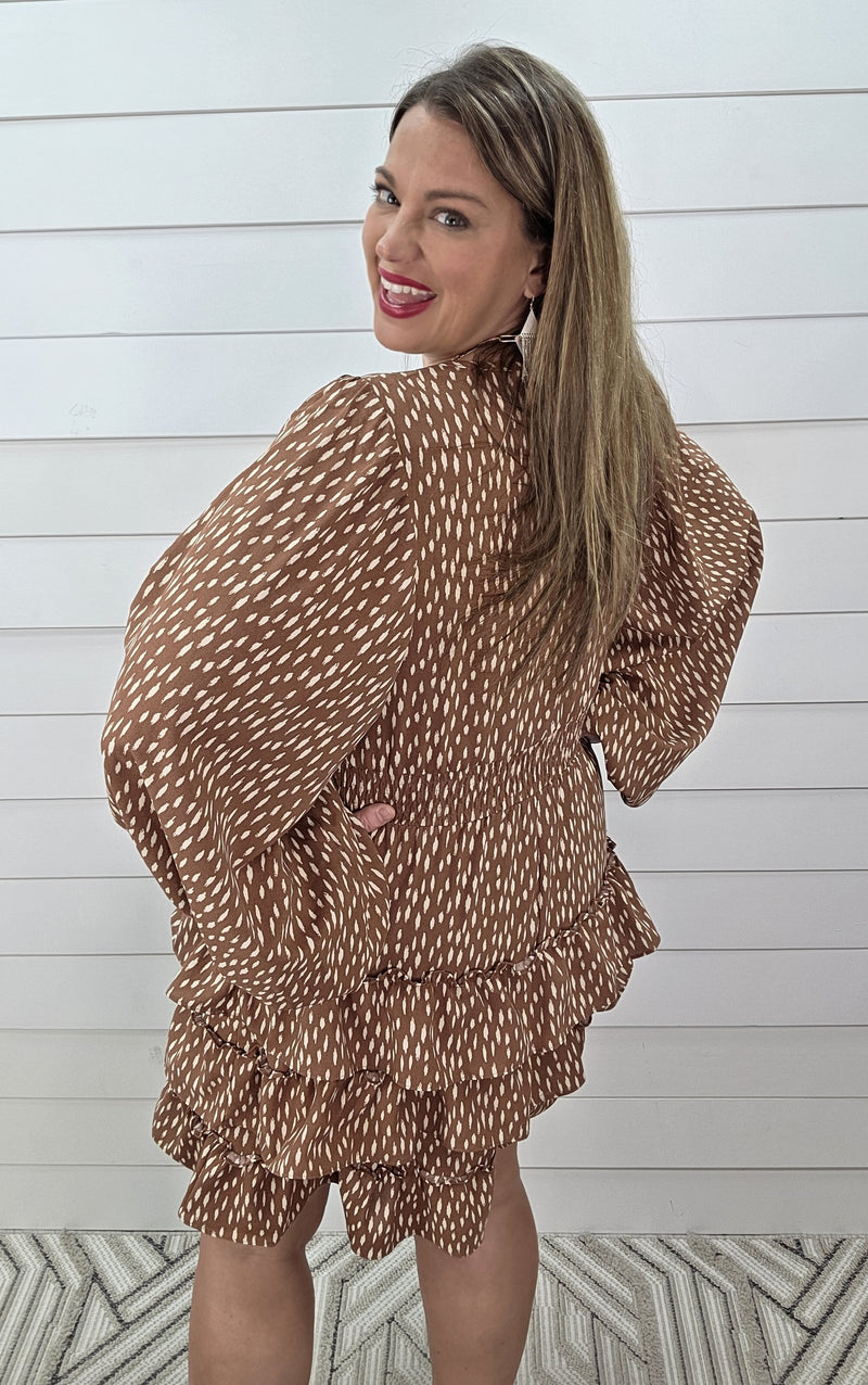 TERRACOTTA PRINTED ELASTIC WAIST RUFFLE TEIRED HEM DRESS