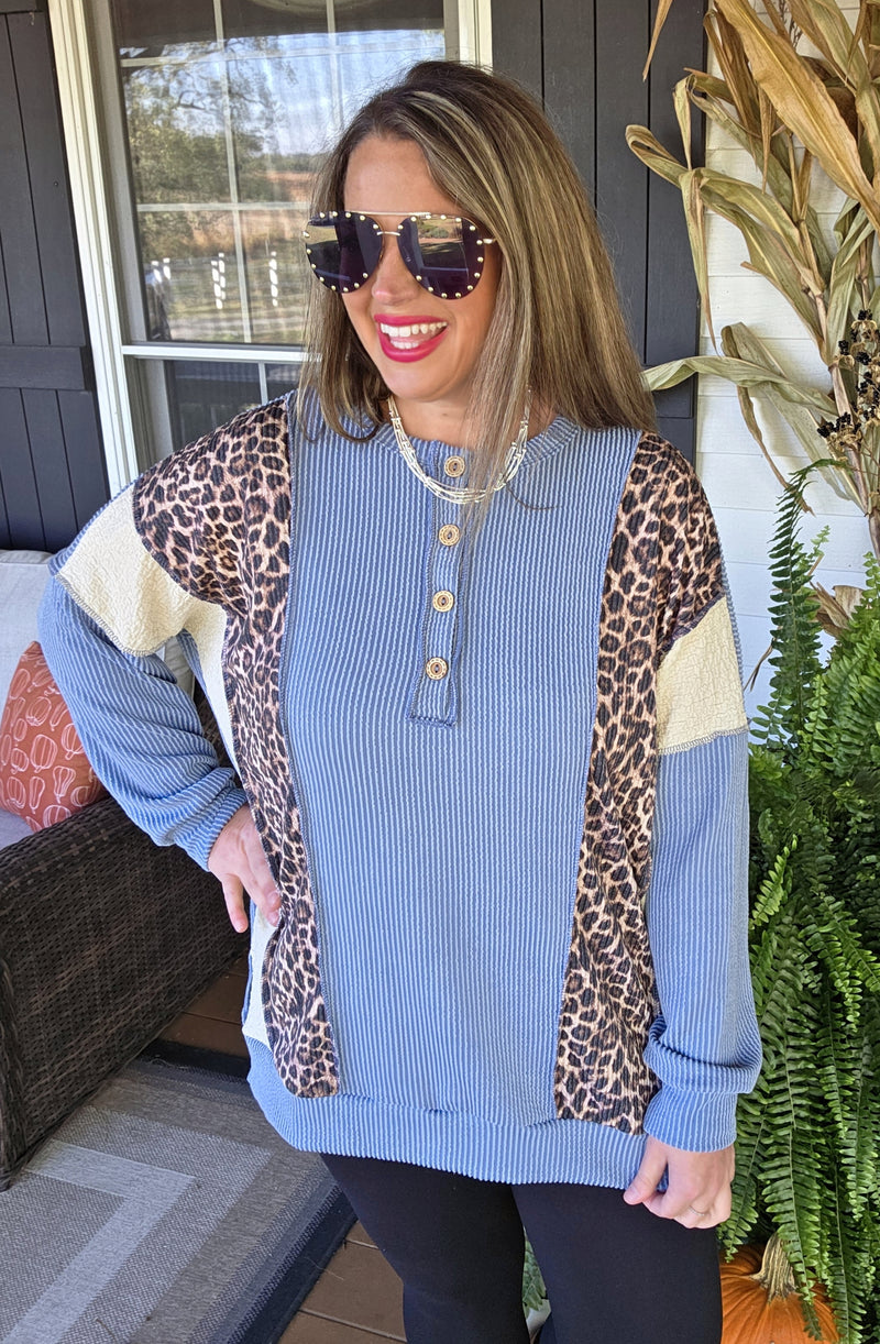 VINTAGE DENIM/ANIMAL COLORBLOCK OVERSIZED RASIED RIBBED HENLEY KNIT TOP