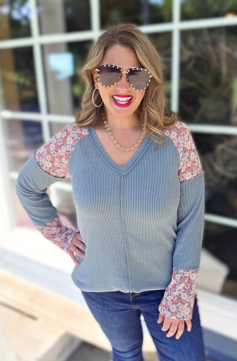 VINTAGE RAISED RIBBED CENTER SEAM KNIT TOP WITH FLORAL SHOULDERS