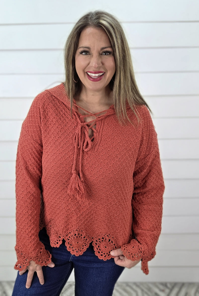 BOHO RED TEXTURED SCALLOPED TRIM PULLOVER SWEATER