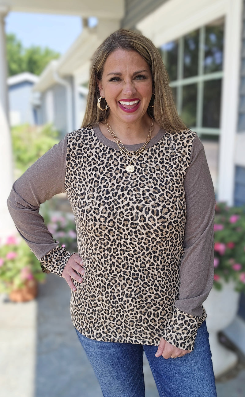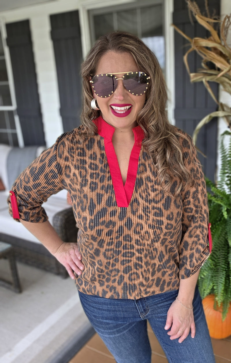 BROWN LEAOPARD/RED TRIM 3/4 SLEEVE KNIT TOP