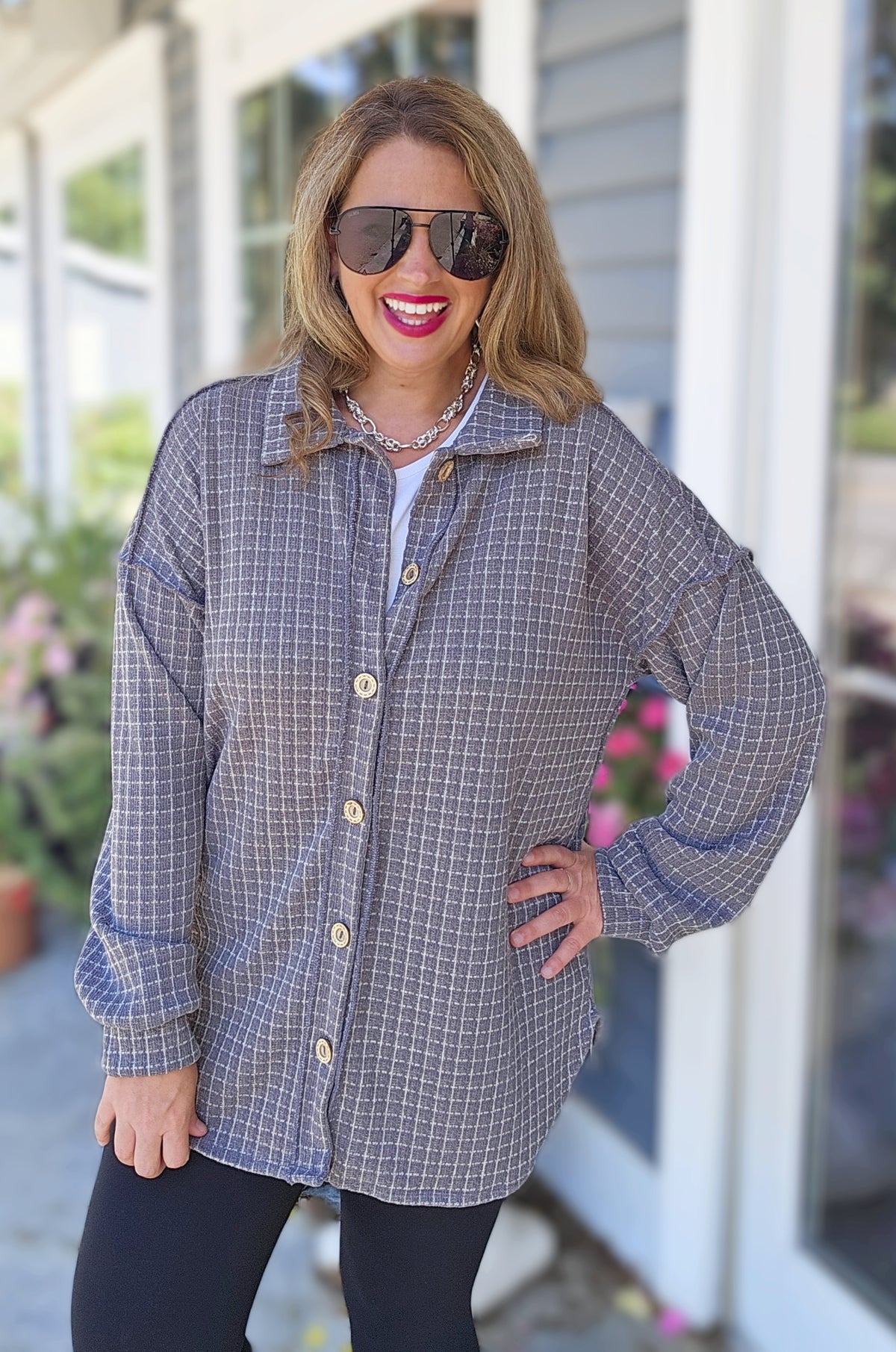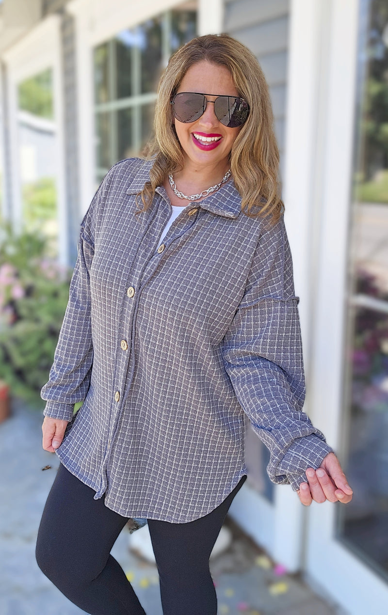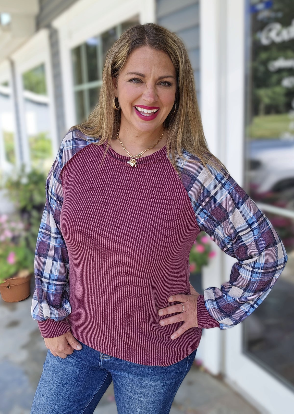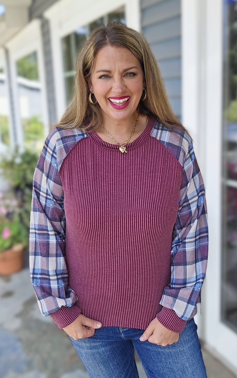 GREY WAFFLE TEXTURE TOP W/ PLAID CONTRAST