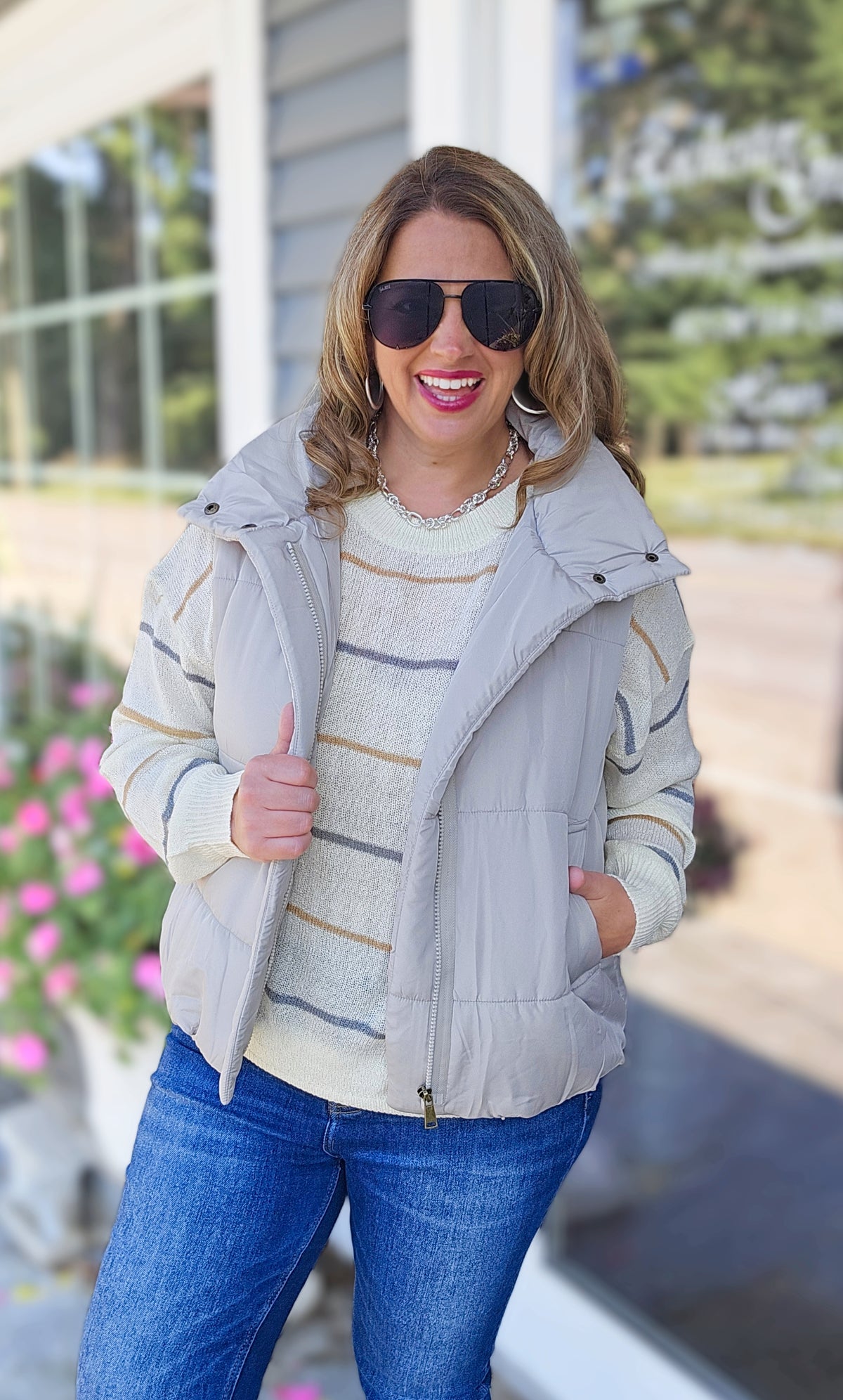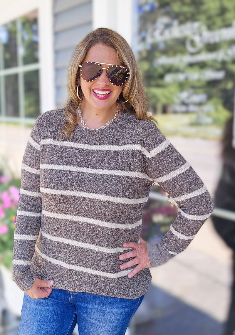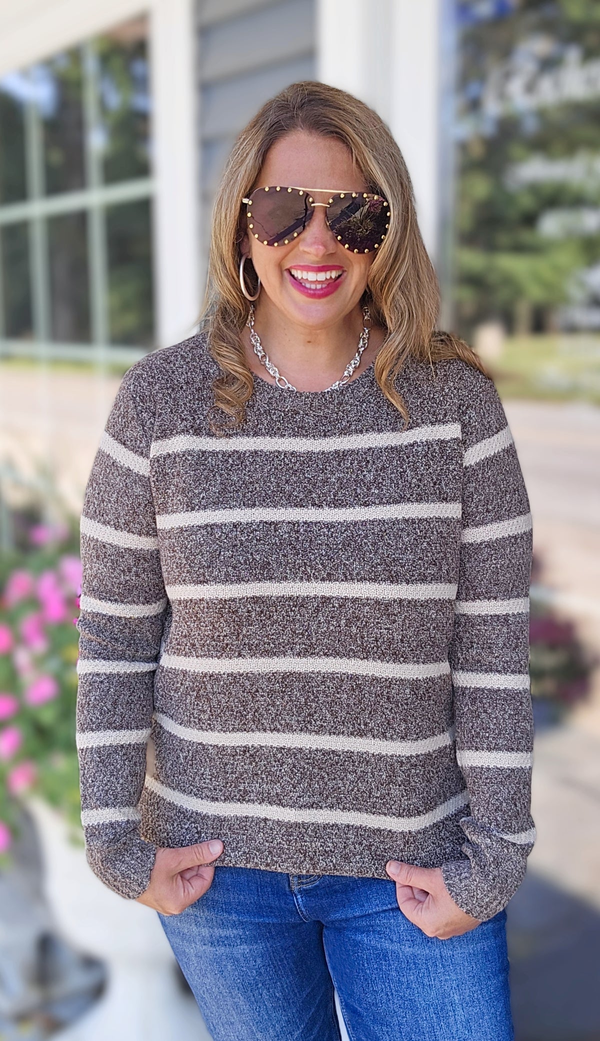 TAUPE/CREAM STRIPED SWEATER W/ HOT PINK TRIM
