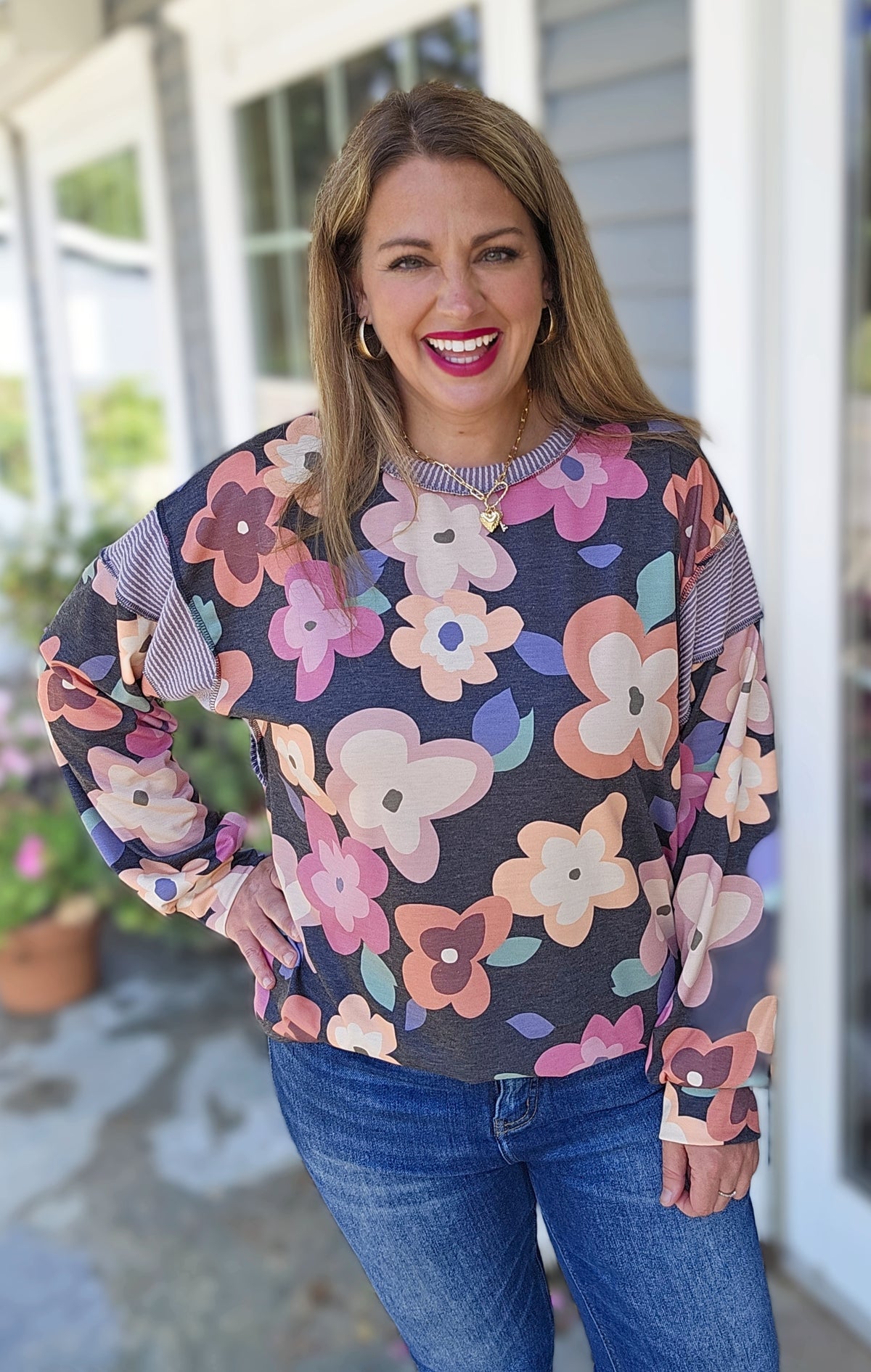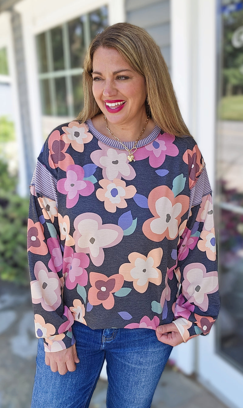 TEAL/CREAM FLORAL CONTAST FRENCH TERRY KNIT TOP