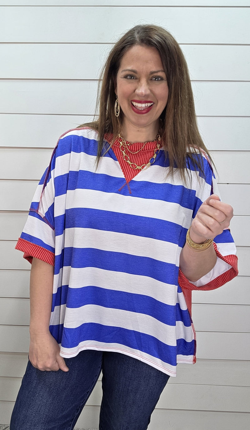 BLUE/WHITE STRIPED W/ RED RAISED RIBBED TRIM KNIT OVERSIZED TOP