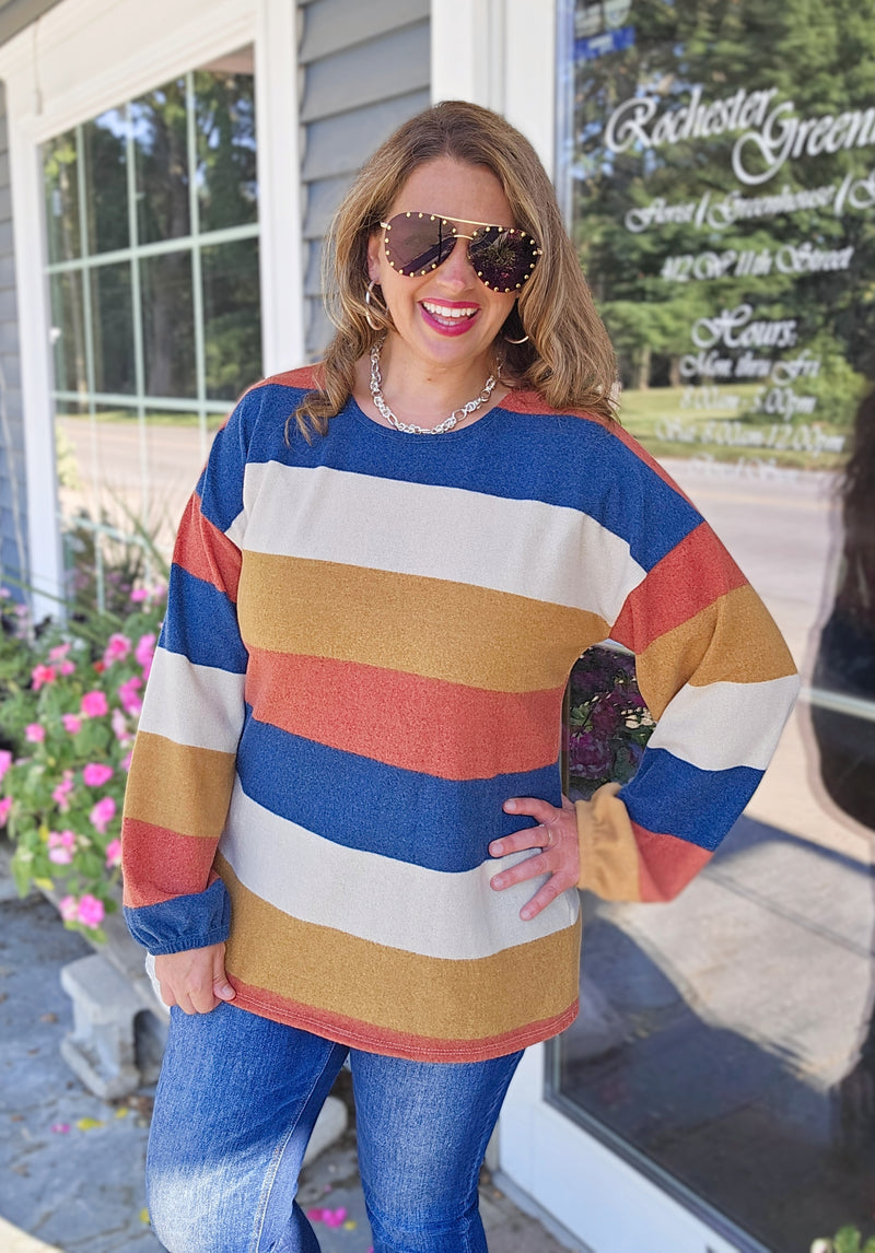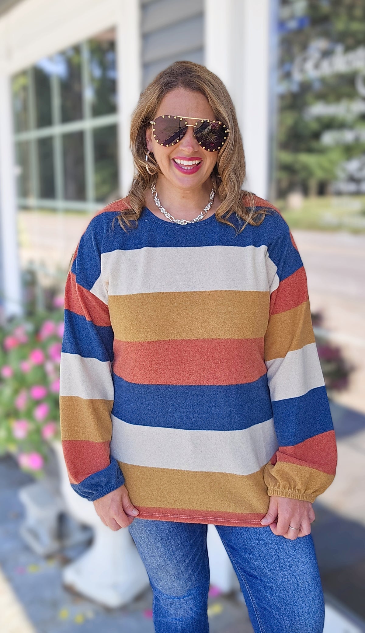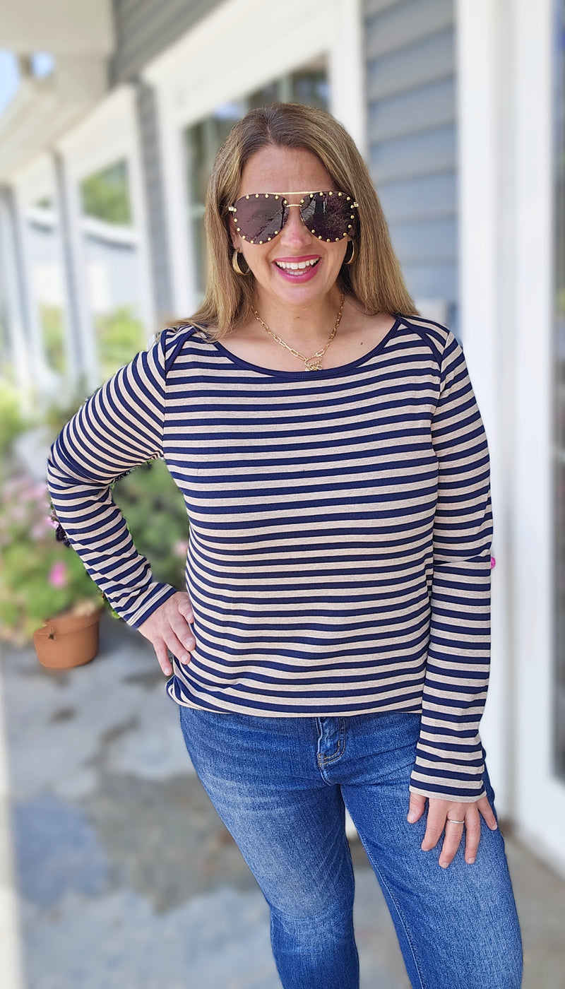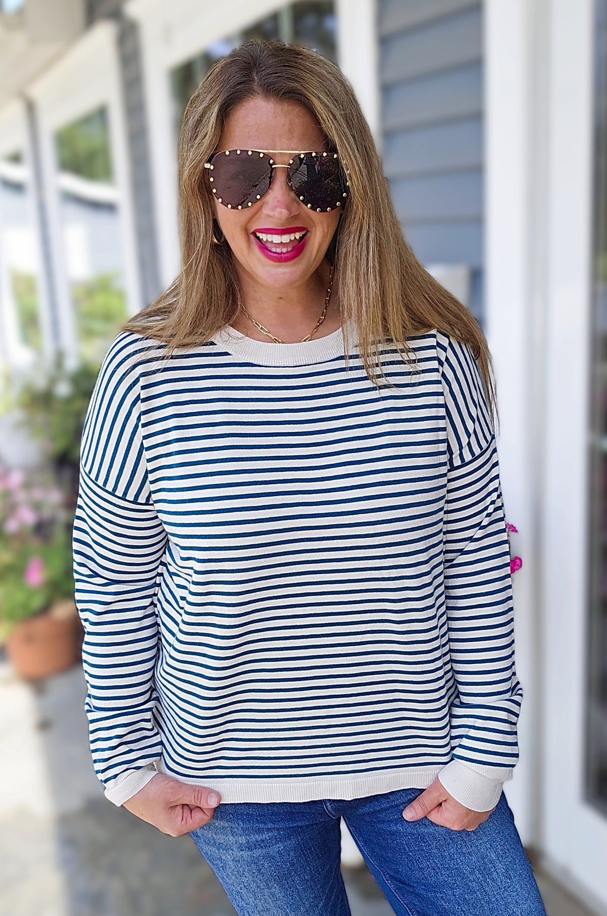 NAVY STRIPED OVERSIZED TOP W/ PINK RAISED RIBBED TRIM