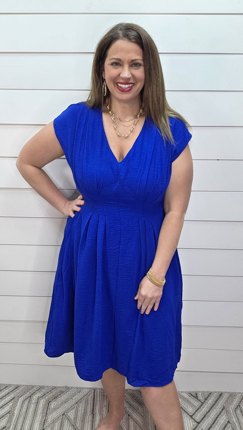 ROYAL BLUE V NECK PLEATED SMOCKED WAISTED CAP SLEEVE DRESS