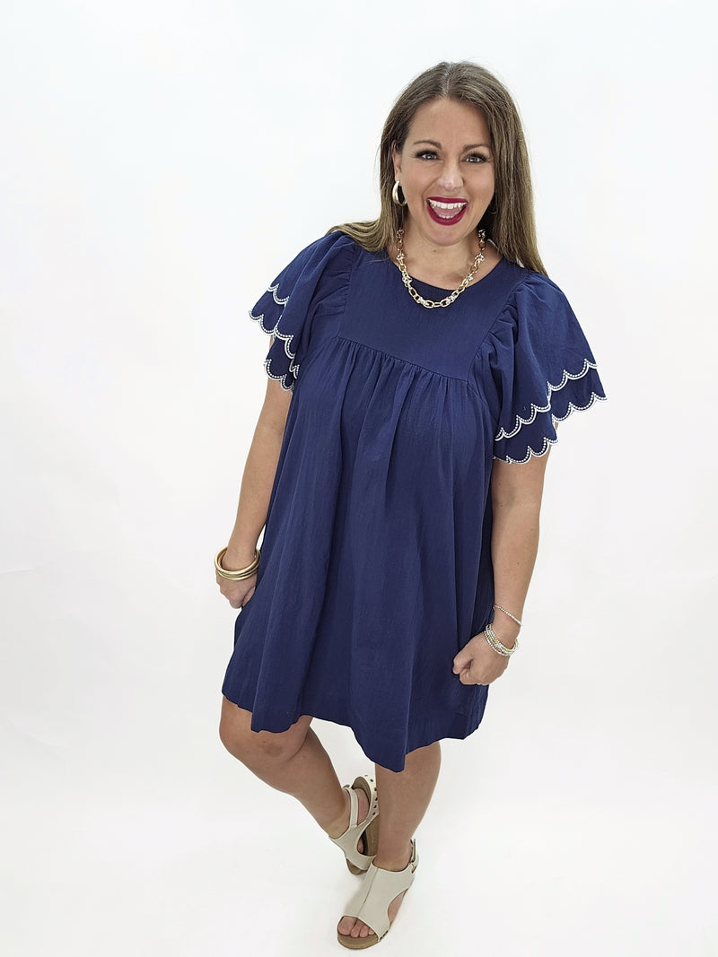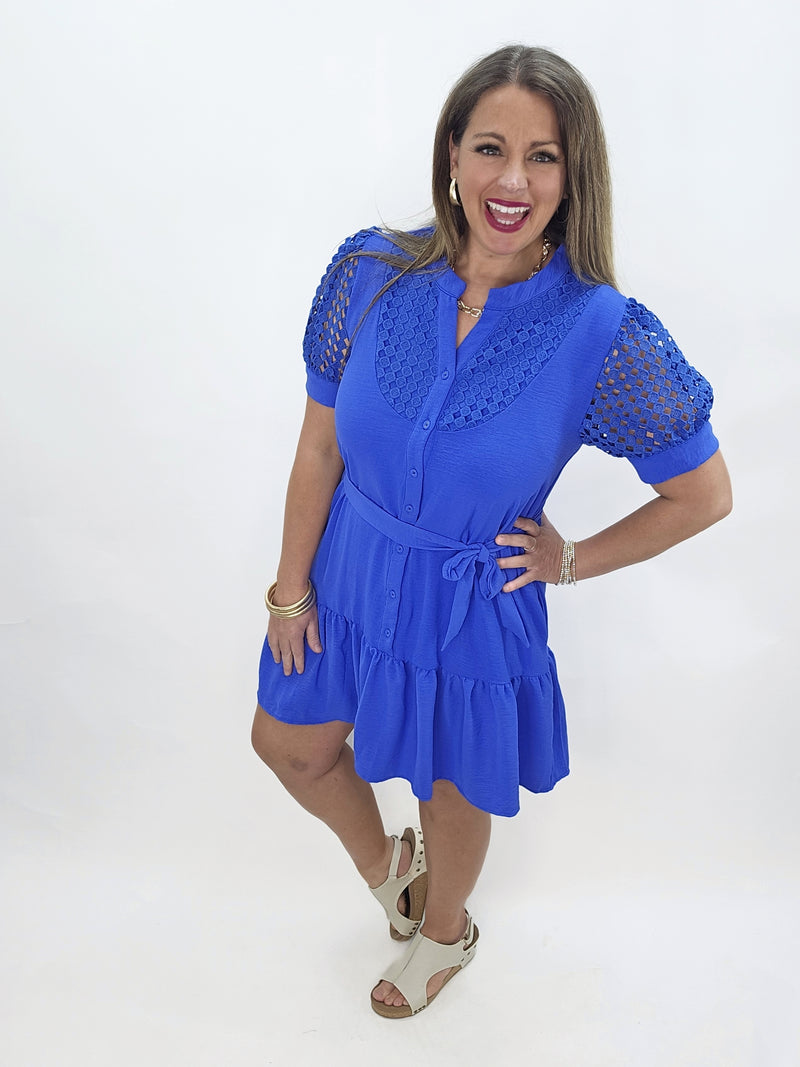 COBALT BLUE BUTTON DOWN CROCHET TRIM DRESS